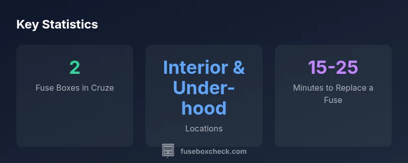 There are two fuse boxes in most Cruzes of this vintage: an under-hood box near the engine compartment and an interior cabin box behind the glove box or under the driver’s knee panel. Always consult the diagram on the cover and the owner’s manual for exact locations.