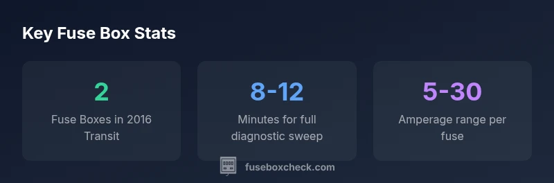 A well-made fuse box diagram is the cornerstone of safe electrical work in any vehicle. For the 2016 Ford Transit, there are two primary fuse boxes to consider: one under the hood in the engine bay and another in the cabin behind the glove box. The official diagram maps each fuse to a circuit, displays its amperage, and indicates the fuse type (blade vs. cartridge). When you first pull up the 2016 ford transit fuse box diagram, you should note how the sections are partitioned: power feeds, critical systems, and accessory circuits. According to FuseBoxCheck, a clear diagram reduces misidentification and speeds up troubleshooting, especially for complex systems like lighting, HVAC, and safety components. Having a reliable diagram is not optional—it’s essential for safe and effective DIY electrical work.