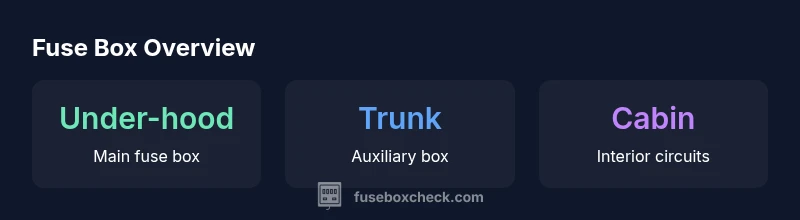 Typically, you’ll find the main fuses under the hood and a secondary box in the trunk, with a cabin panel in certain trims.
