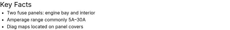 | Cabin dash panel | Interior fuse box | Lighting, accessories, and auxiliary systems | Glove box panel or under-dash access |
