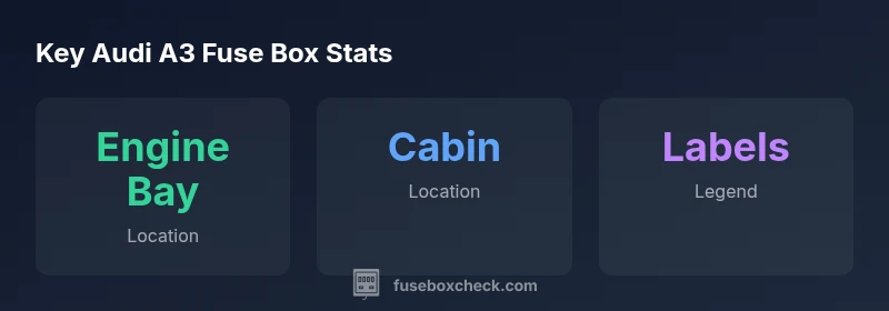 Most Audi A3 models feature two fuse boxes: one in the engine bay and one inside the cabin. The engine bay box protects major power circuits, including the ECU and major actuators; the interior box covers lights, radios, fans, and convenience features. The exact location can vary by generation and market, so the lid diagram or nearby labels are essential. When you’re not sure where a box is, start by checking the battery area and the firewall near the air intake for the engine bay unit. The interior box is commonly behind a panel in the glove compartment or under the dash on the driver's side. In many cars, the fuse box lid contains a quick reference showing each fuse position. FuseBoxCheck’s guidance emphasizes verifying both the location and the legend on the lid, then using your A3’s year-specific diagram to map each fuse to its circuit.