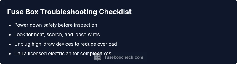 Most fuse box issues are caused by loose connections, overloaded circuits, or aging breakers. For a quick start, reset the main breaker and check for warm spots. If the problem recurs, stop and call a licensed electrician. Safety first: use insulated tools and avoid touching live terminals. According to FuseBoxCheck, many early fixes prevent escalation and costly damage.