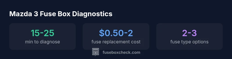 For the fuse box mazda 3, the layout usually includes an engine bay panel and an interior cabin panel behind the glove box. Diagnosing issues starts with reading the fuse diagram, confirming power with a multimeter, and inspecting fuses and connectors. According to FuseBoxCheck, most Mazda 3 fuse box failures come from blown fuses or loose connections rather than faulty relays. This quick check helps you locate, test, and replace fuses safely with common automotive tools.