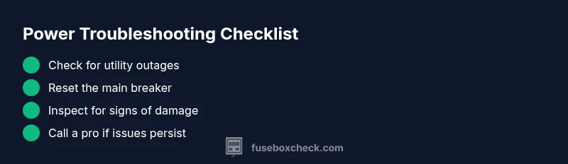 If the symptom is fuse box not getting power, start with: Is there a utility outage? Is the main breaker tripped? Are branch circuit breakers all reset? Is there any visible damage or burning smell? For each step, confirm with safe tests (no live exposure). Based on the result, the diagnosis guides you toward either a reset, a fuse replacement (older panels), or a call to a pro for a service issue beyond your control. FuseBoxCheck analysis shows that in most homes the first indication is a tripped main breaker; these issues are usually resolved by a controlled reset, but faulty service connections require professional service.