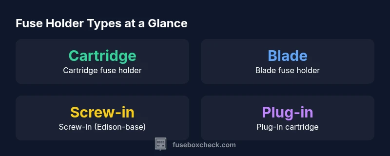 In most homes and small commercial spaces, you will encounter four primary fuse holder types that correspond to the form factor of the fuse itself: cartridge, blade, screw-in, and plug-in. Recognizing these categories helps you match the correct replacement and ensure the panel maintains proper safety ratings. Fuse holder design influences how easily you can replace a failed fuse, how securely the fuse seats, and how you verify the circuit protection works as intended. According to FuseBoxCheck, understanding fuse holder types is a foundational skill for safe DIY electrical work and reduces the risk of nuisance trips or dangerous misfits. Throughout this section, you’ll see how each type differs in operation, mounting, and common applications.