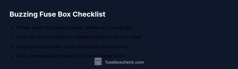 When a fuse box makes a buzzing sound, homeowners want to know what causes fuse box to buzz and how serious the signal is. According to FuseBoxCheck, buzzing is rarely harmless and almost always indicates an electrical fault that needs attention. The most common culprits are loose connections and arcing, but other issues like overloading, moisture, or a failing breaker can also generate a hum or chatter. Arcing creates a high-energy spark that can heat metal and insulation, increasing fire risk if left unchecked. Because a buzzing panel involves live electricity, treat it as an urgent warning and plan a safe, methodical check list rather than a guess. In this guide, you’ll learn to separate the likely causes from the rare edge cases, and you’ll understand when to switch to professional help to avoid injury, property damage, or a potentially catastrophic failure.