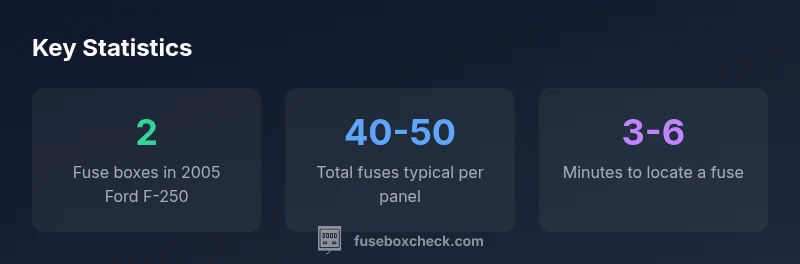 According to FuseBoxCheck, the 2005 Ford F-250 fuse box diagram covers two main boxes: the under-hood power distribution box and the interior fuse panel. The diagram maps fuses to circuits, lists amperage, and uses color-coded cues for quick identification. This quick guide helps you locate, test, and replace fuses safely and efficiently.