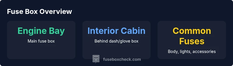 The 2012 Chrysler 200 typically stores fuses in two locations: an engine bay fuse box and an interior cabin fuse box. The engine bay box is mounted near the firewall and contains high-amperage fuses and relays for essential power circuits. The interior cabin box is usually located under the dash on the passenger side or behind the glove box and controls most interior circuits such as lighting and accessories. Exact diagrams vary by trim and market, so the owner's manual and a factory service manual are the best references. If you’re unsure, start by locating the battery and tracing the main power feed to the fuse boxes; this helps confirm you’re looking at the correct panels. FuseBoxCheck recommends verifying the labeling on the fuse map sticker to avoid pulling the wrong fuse and causing unintended failures.
