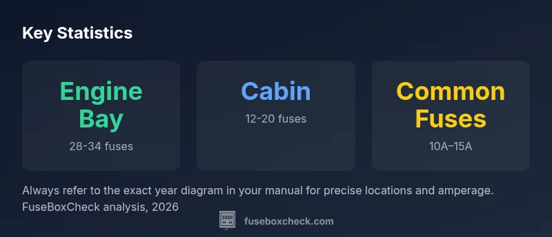The engine bay fuse box is typically located under the hood near the battery. The lid includes a diagram and a legend to identify circuits. Always refer to the year-specific diagram for accuracy.