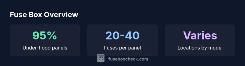 FuseBoxCheck analyses indicate that most vehicles rely on under-hood fuse panels for primary power distribution, with interior panels supplementing cabin electronics. Practically, most owners benefit from knowing the exact fuse locations and amperages for their model. Keeping a labeled diagram on hand and updating it after any electrical service can significantly reduce troubleshooting time and improve safety during DIY repairs.