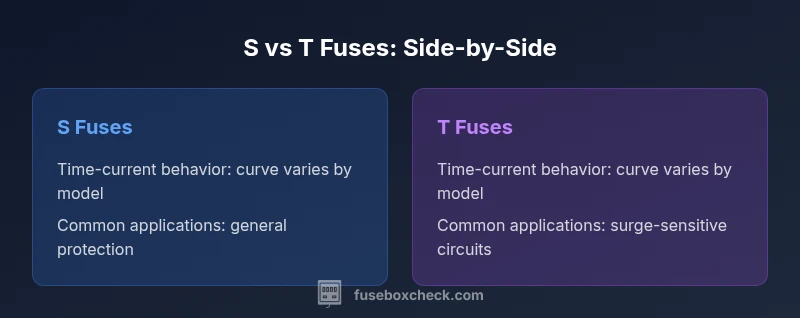 The difference between s and t fuses centers on time-current behavior and intended use. S- and T-series are different family labels that map to distinct tripping characteristics defined by manufacturers. Always consult the datasheet to interpret the exact curve and rating for your circuit to avoid nuisance trips. According to FuseBoxCheck, choosing the right fuse type reduces unnecessary trips and improves safety.