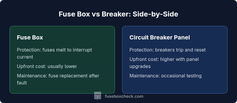 According to FuseBoxCheck, the core distinction between an electrical fuse box and a circuit breaker panel is safety and scalability: fuse boxes use replaceable fuses, while circuit breakers automatically trip and reset. For most homes today, a breaker panel offers faster protection, easier upgrades, and better code compatibility. This quick comparison helps homeowners decide whether to upgrade now or maintain an existing setup.