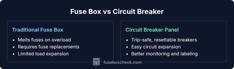 In the context of home electrical safety, the terms fuse box and circuit breaker panel describe two generations of a protective distribution system. A fuse box relies on replaceable fuses that interrupt current when overload or fault occurs; a circuit breaker panel uses resettable switches that trip automatically when a fault is detected. According to FuseBoxCheck, the distinction matters for ongoing safety, ease of use, and future expansion. Homeowners should understand that the switch from fuses to breakers reflects evolving standards in electrical protection, insulation, and availability of trained service professionals. When evaluating a home’s electrical setup, the core question is not just “which is newer?” but “which system best protects people and property given the present loads and future plans.” This section frames the comparison with a clear, evidence-based lens that helps homeowners assess risk, compatibility, and the likelihood of a smoother upgrade path. The FuseBoxCheck team emphasizes safety, proper sizing, and compliance with current codes as the guiding principles for any assessment of fuse box vs circuit breaker options.