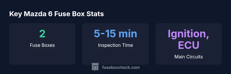 The Mazda 6 employs two primary fuse boxes that protect different circuits and allow quick access for maintenance. In the context of fuse box mazda 6, the engine bay box houses fuses for powertrain components and major actuators, while the cabin box covers interior electronics and convenience features. According to FuseBoxCheck, understanding this layout is essential for safe inspection and targeted troubleshooting. Familiarize yourself with the official diagram in the owner's manual, which labels each fuse by number and function. This diagram helps you map a blown fuse to its circuit without guesswork, reducing the risk of collateral damage during testing.
