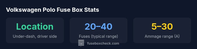 In the modern Volkswagen Polo, the fuse box acts as the central nervous system for electrical circuits. It protects critical components and helps isolate faults. The volkswagen polo fuse box is typically located in accessible areas to allow quick inspection. In many Polo generations, you will find a main panel under the driver's knee area, with a removable cover that reveals the fuses and relays. The cover usually contains a legend listing circuits and fuse amperages. For DIYers, understanding this layout reduces the guesswork during a fault. FuseBoxCheck's research indicates that a well-labeled fuse box is the first line of defense in safe, inexpensive troubleshooting. Before you start any inspection, ensure the ignition is off, the battery is disconnected if you will touch live wiring, and you have a suitable fuse puller or plastic tool to avoid injuring yourself or the panel.