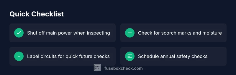 Safety should be your top priority when dealing with a ticking fuse box. If you notice sparks, smoke, a burning smell, or scorch marks on the panel, evacuate and call emergency services if the situation worsens. If there are no obvious hazards, avoid touching live parts. Do not attempt to bypass safety devices or replace breakers without proper training. If you can do so safely, switch off power at the main breaker to stop current flow and minimize risk. Keep children and pets away from the panel during inspection and plan a call to a licensed electrician for a thorough diagnosis. FuseBoxCheck emphasizes that safety is non-negotiable in electrical work.